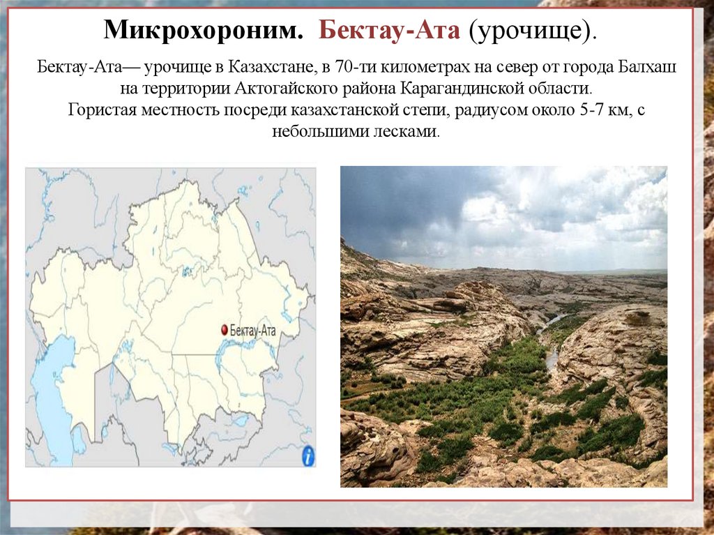 Микрохороним. Бектау-Ата (урочище).Бектау-Ата— урочище в Казахстане, в 70-ти километрах на север от города Балхаш