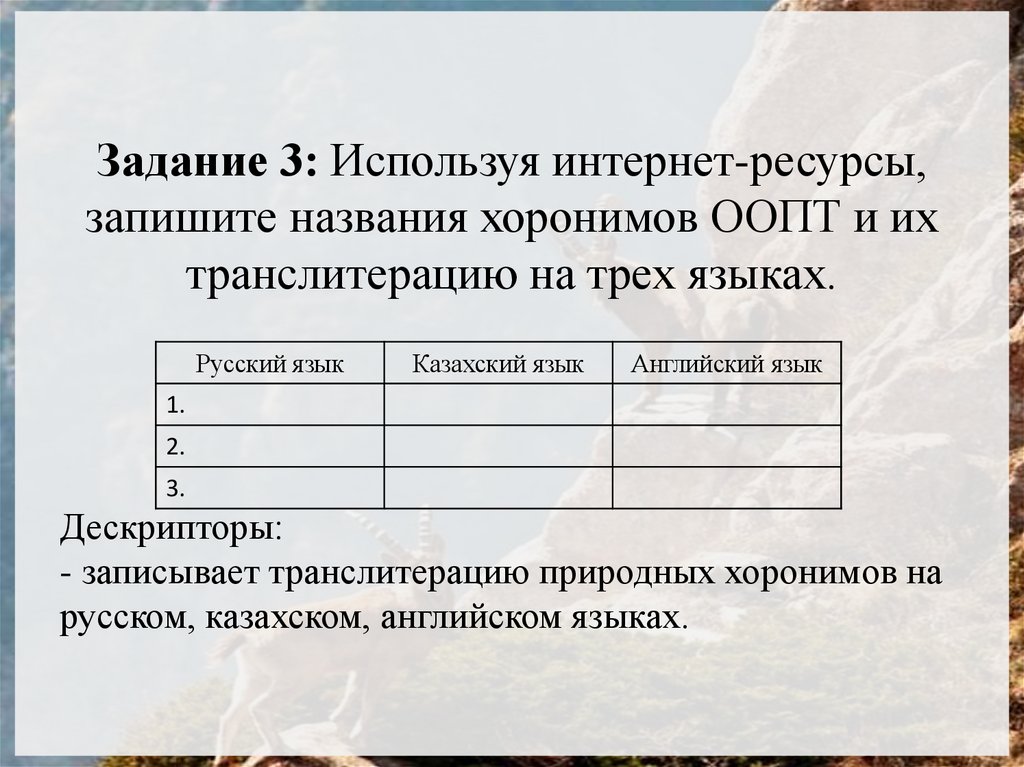 Задание 3: Используя интернет-ресурсы,запишите названия хоронимов ООПТ и их