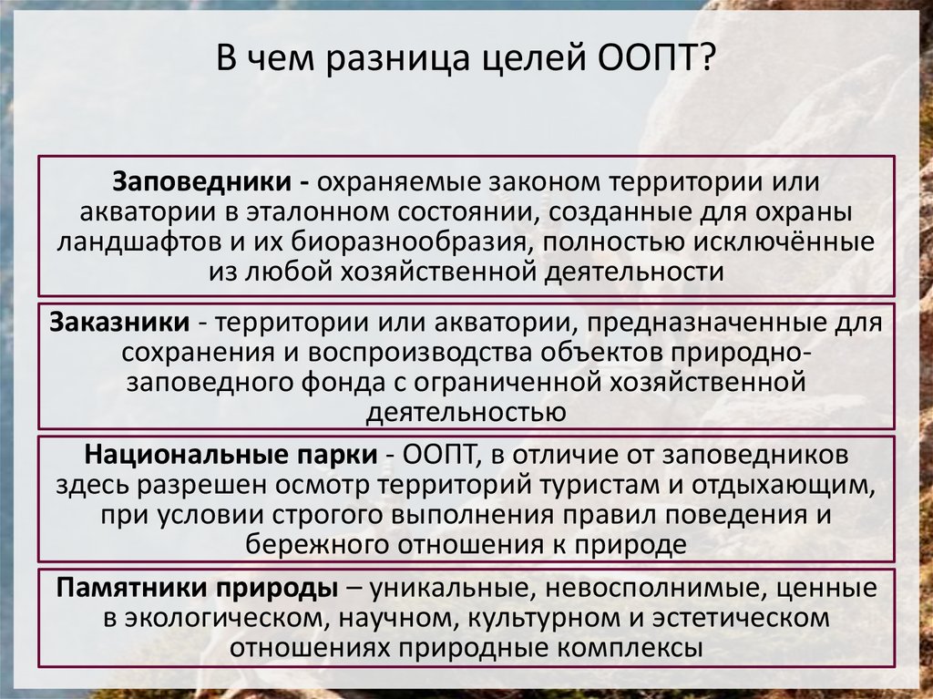 В чем разница целей ООПТ?Заповедники - охраняемые законом территории или