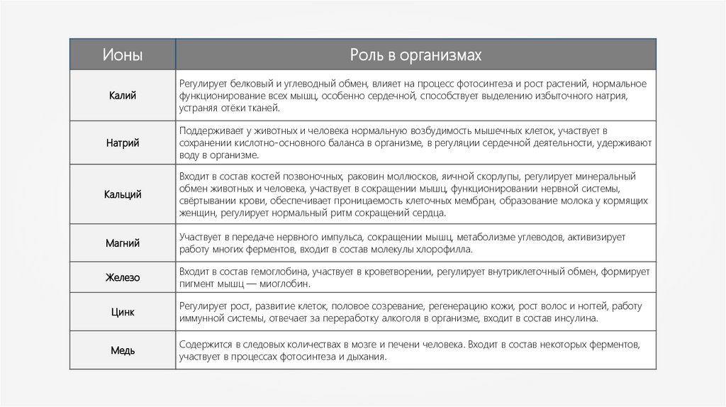 Участвует в передаче нервного импульса, сокращении мышц, метаболизме углеводов, активизирует