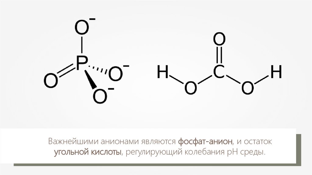 Важнейшими анионами являются фосфат-анион, и остатокугольной кислоты, регулирующий колебания рН среды.