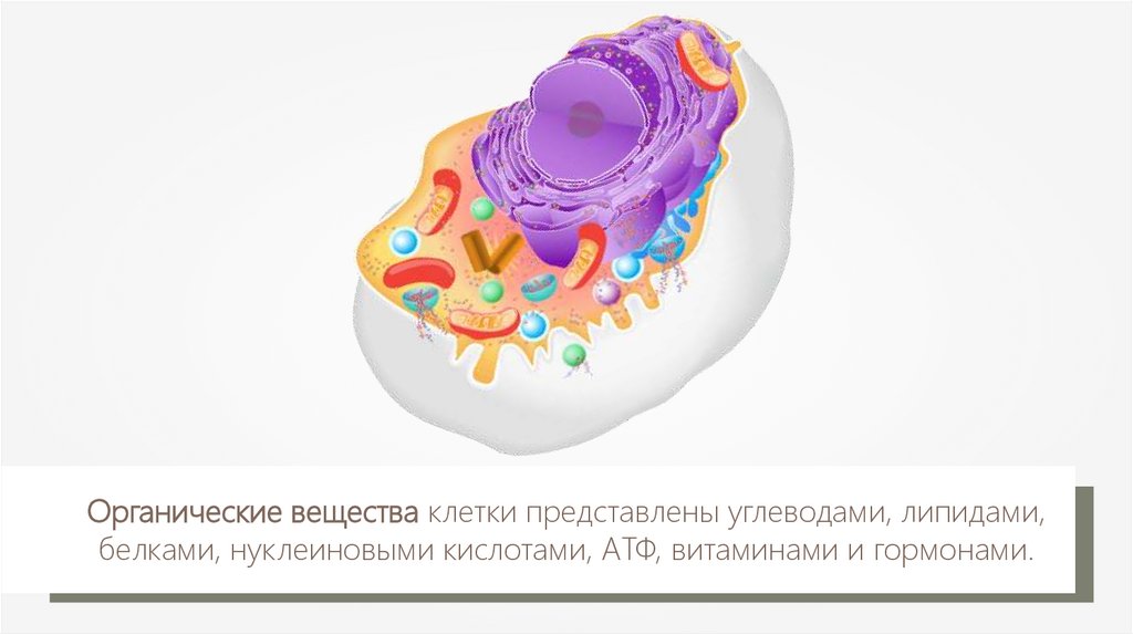 Органические вещества клетки представлены углеводами, липидами,белками, нуклеиновыми кислотами, АТФ, витаминами и гормонами.