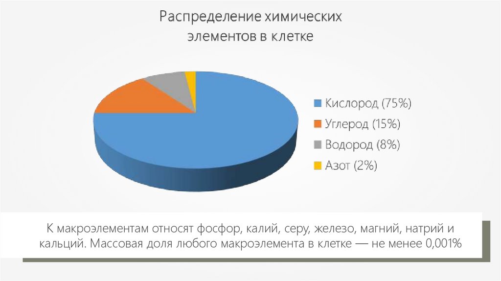 К макроэлементам относят фосфор, калий, серу, железо, магний, натрий икальций. Массовая доля любого макроэлемента в клетке — не менее 0,001%
