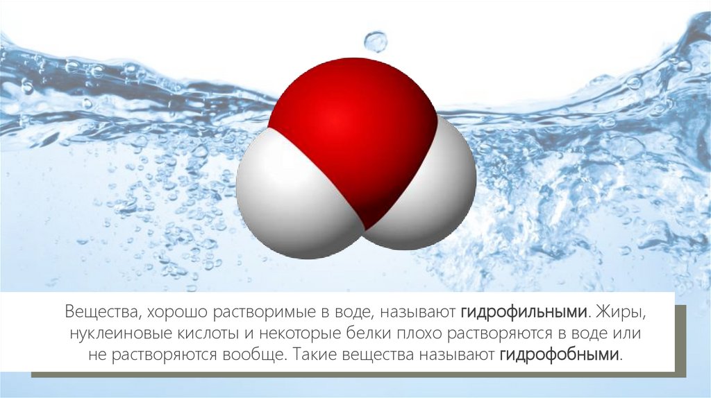 Вещества, хорошо растворимые в воде, называют гидрофильными. Жиры,нуклеиновые кислоты и некоторые белки плохо растворяются в воде или