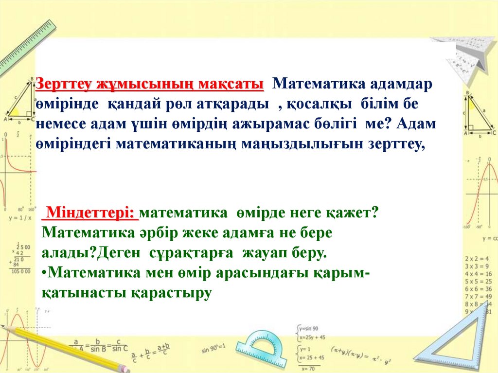 Зерттеу жұмысының мақсаты Математика адамдарөмірінде қандай рөл атқарады , қосалқы білім бе