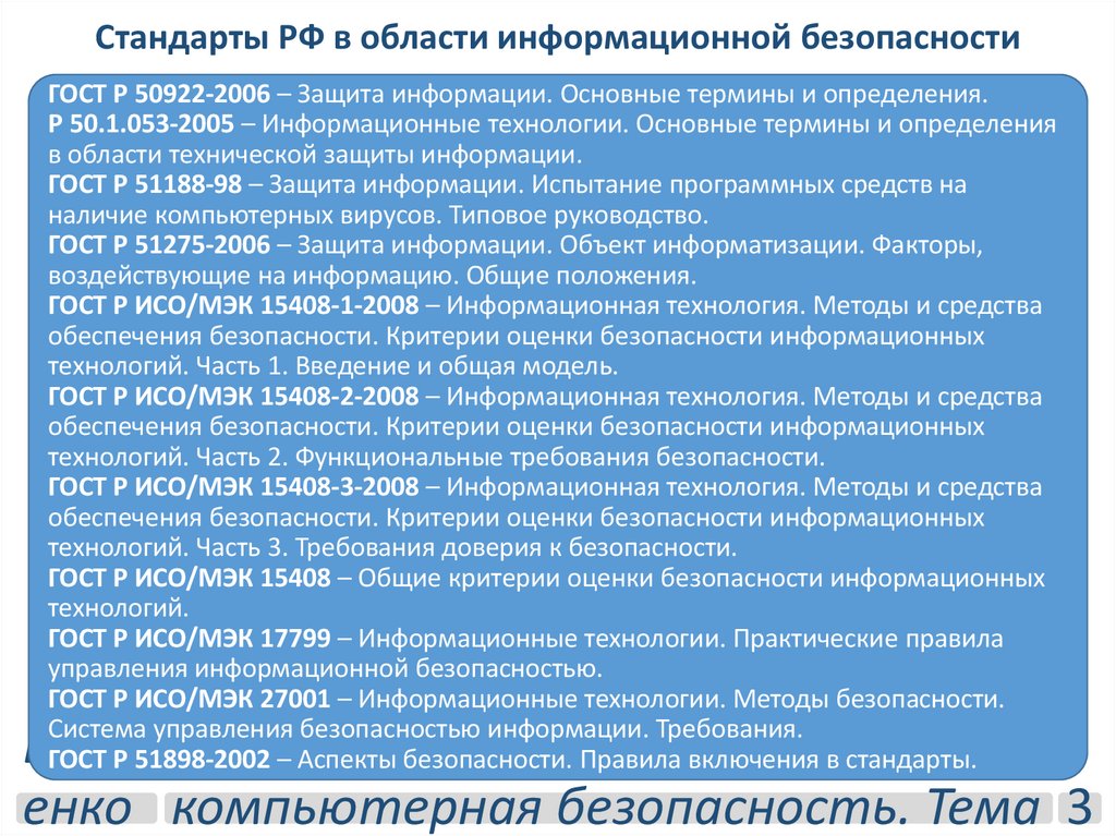 Стандарты РФ в области информационной безопасностиГОСТ Р 50922-2006 – Защита информации. Основные термины и определения.