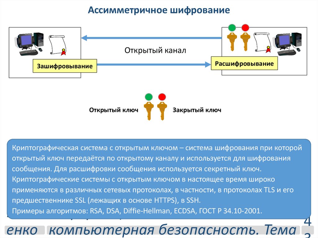 Примеры алгоритмов: RSA, DSA, Diffie-Hellman, ECDSA, ГОСТ Р 34.10-2001.