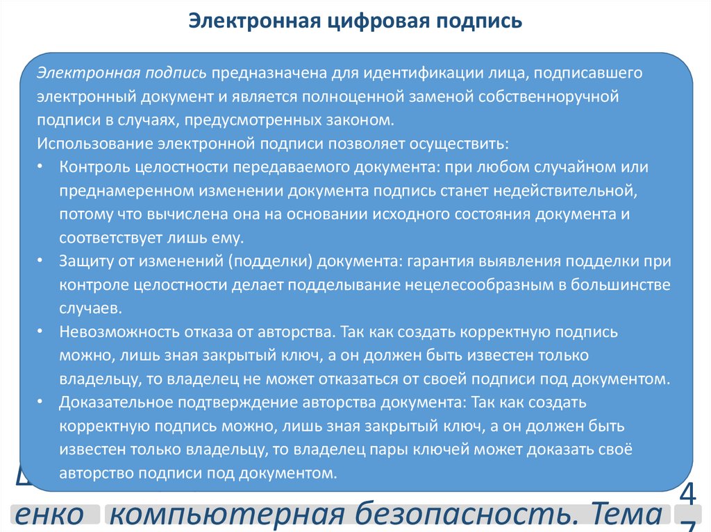 Электронная цифровая подписьЭлектронная подпись предназначена для идентификации лица, подписавшего