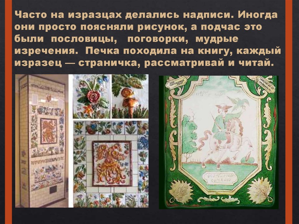 Часто на изразцах делались надписи. Иногдаони просто поясняли рисунок, а подчас это