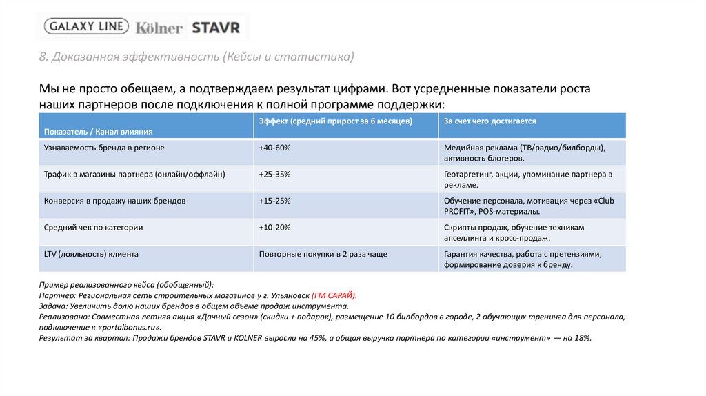 8. Доказанная эффективность (Кейсы и статистика)Мы не просто обещаем, а подтверждаем результат цифрами. Вот усредненные показатели роста