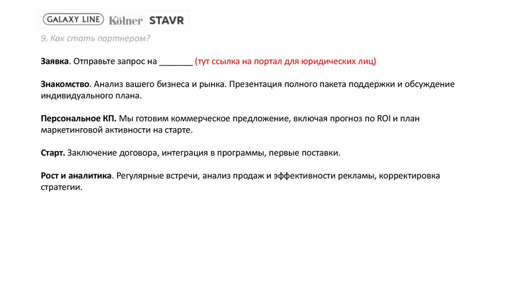 9. Как стать партнером?Заявка. Отправьте запрос на _______ (тут ссылка на портал для юридических лиц)