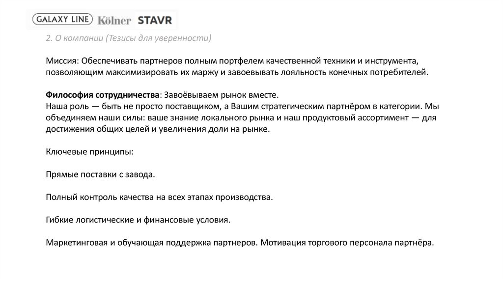 2. О компании (Тезисы для уверенности)Миссия: Обеспечивать партнеров полным портфелем качественной техники и инструмента,