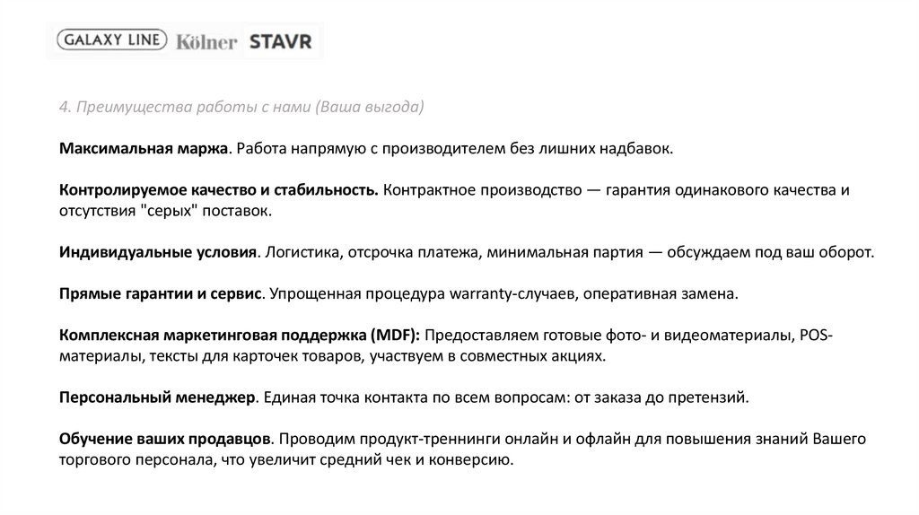 4. Преимущества работы с нами (Ваша выгода)Максимальная маржа. Работа напрямую с производителем без лишних надбавок.