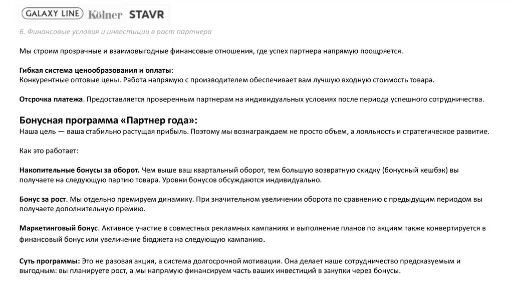 6. Финансовые условия и инвестиции в рост партнераМы строим прозрачные и взаимовыгодные финансовые отношения, где успех партнера напрямую поощряется.