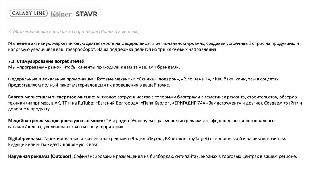 7. Маркетинговая поддержка партнеров (Полный комплекс)Мы ведем активную маркетинговую деятельность на федеральном и региональном уровнях, создавая устойчивый спрос на продукцию и