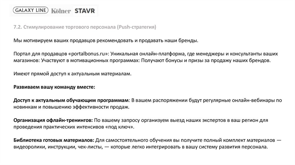 7.2. Стимулирование торгового персонала (Push-стратегия)Мы мотивируем ваших продавцов рекомендовать и продавать наши бренды.