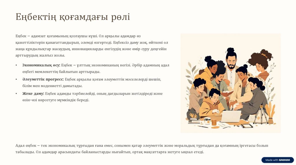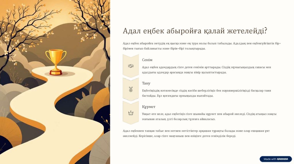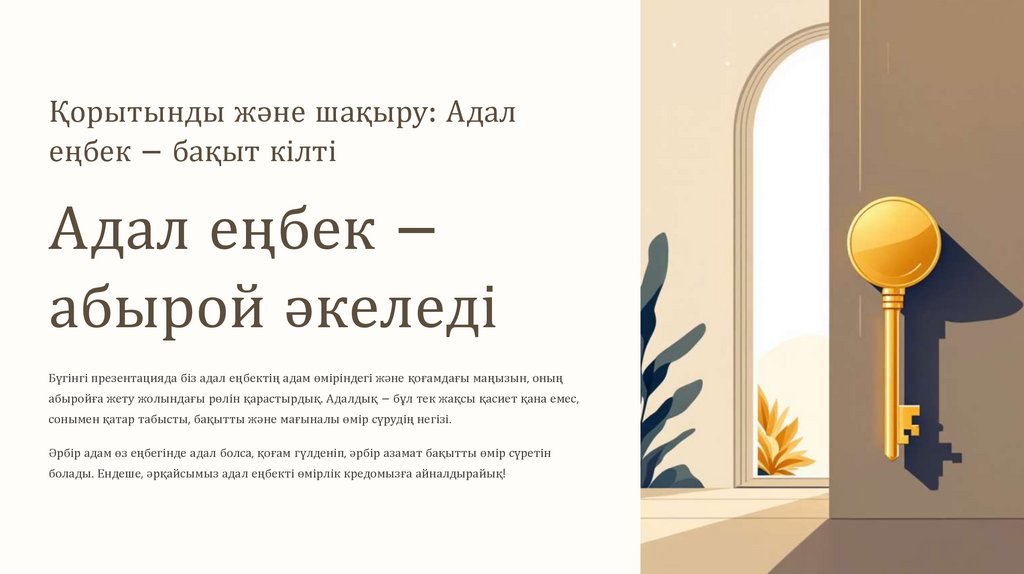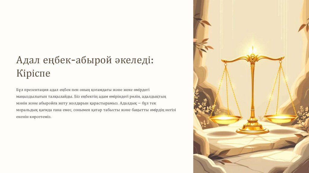 Бұл презентация адал еңбек пен оның қоғамдағы және жеке өмірдегі