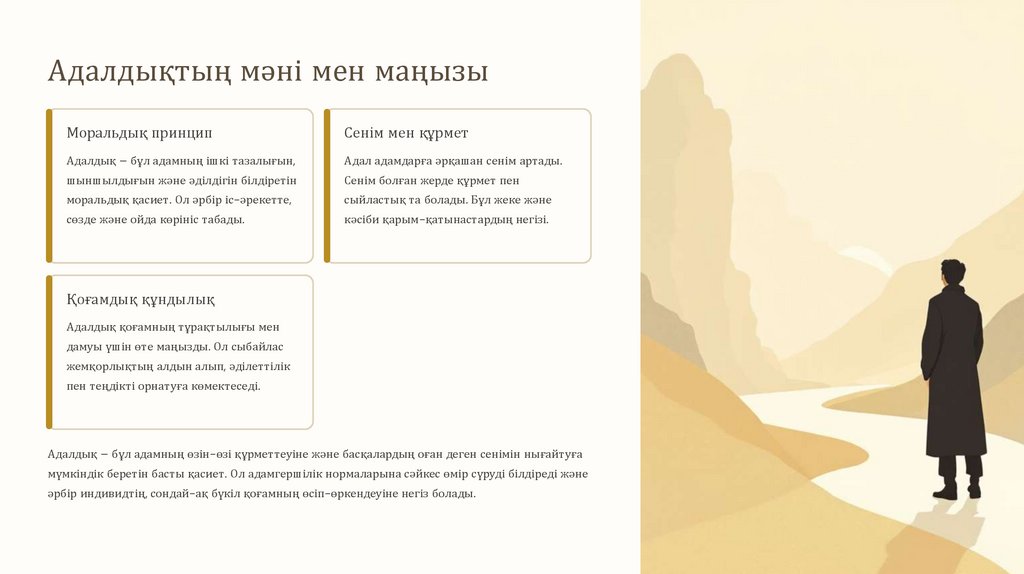 Адалдық – бұл адамның өзін-өзі құрметтеуіне және басқалардың оған деген сенімін нығайтуға
