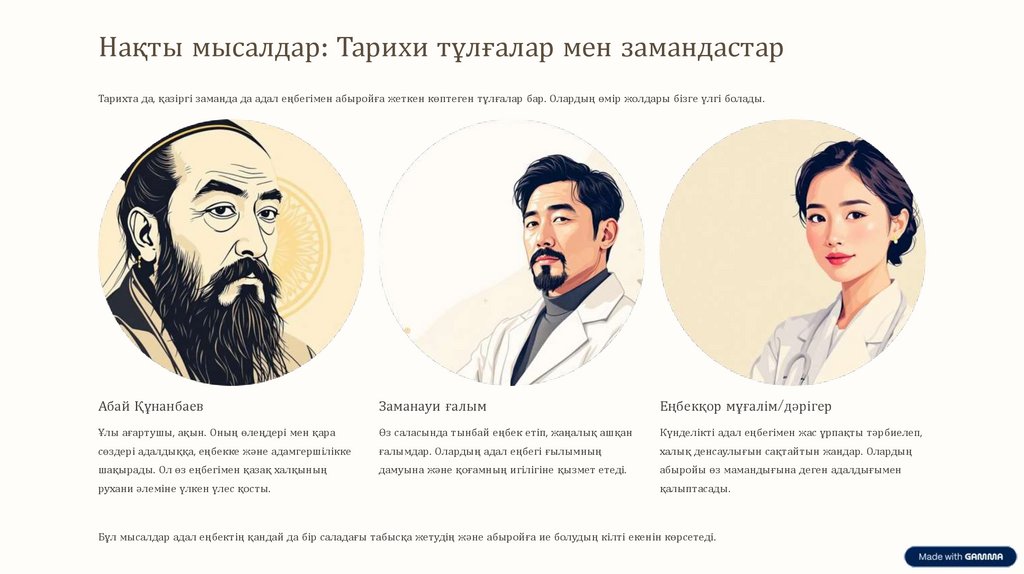 Нақты мысалдар: Тарихи тұлғалар мен замандастарТарихта да, қазіргі заманда да адал еңбегімен абыройға жеткен көптеген тұлғалар бар. Олардың өмір жолдары бізге үлгі болады.