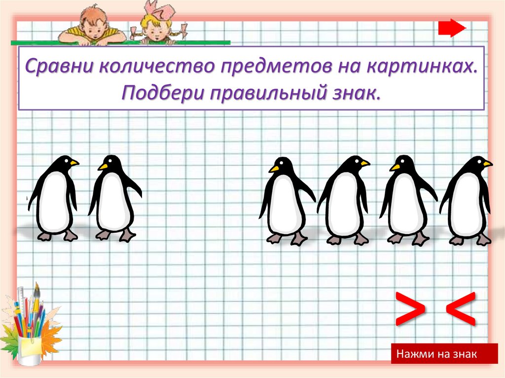Сравни количество предметов на картинках.Подбери правильный знак.