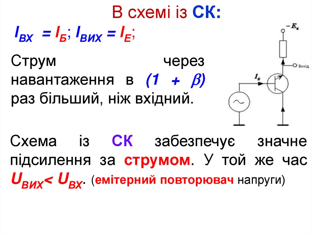 В схемі із СК:ІВХ = ІБ; ІВИХ = ІЕ;
