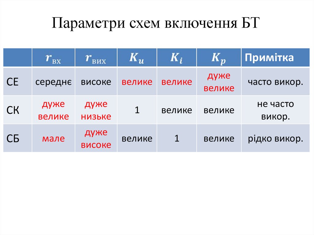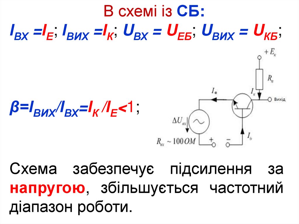 В схемі із СБ:ІВХ =ІЕ; ІВИХ =ІК; UВХ = UЕБ; UВИХ = UКБ;