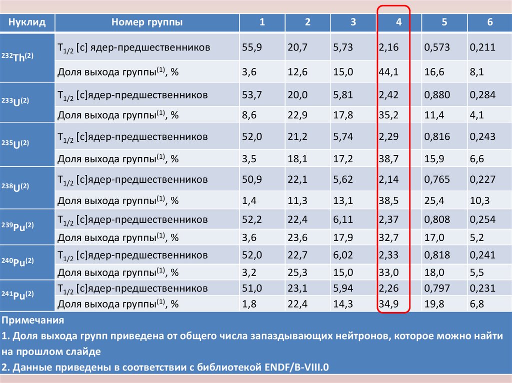 1. Доля выхода групп приведена от общего числа запаздывающих нейтронов, которое можно найти