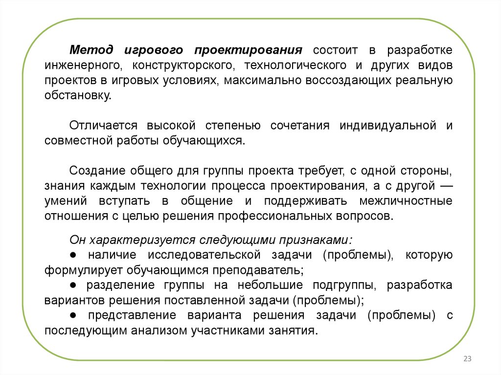 Метод игрового проектирования состоит в разработкеинженерного, конструкторского, технологического и других видов