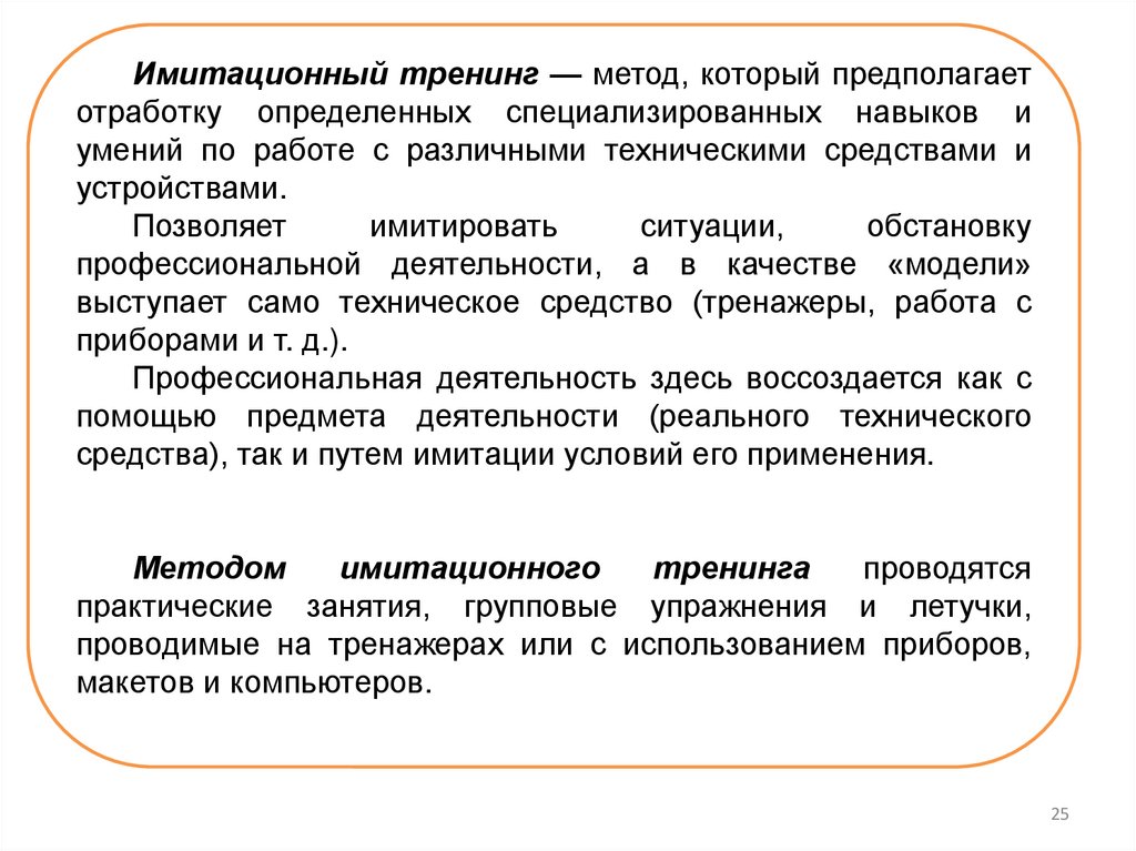Имитационный тренинг — метод, который предполагаетотработку определенных специализированных навыков и