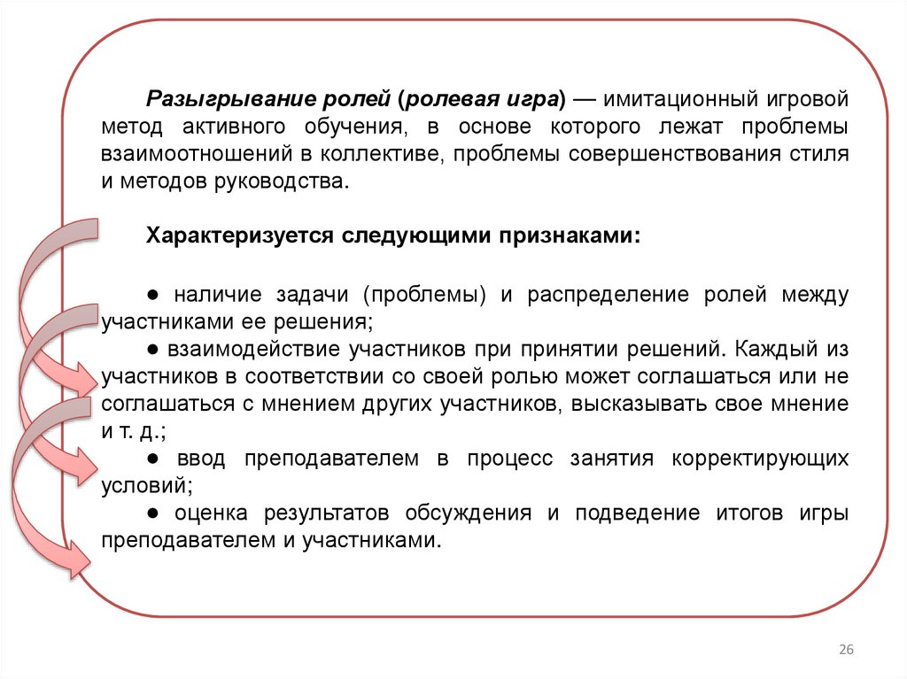 Разыгрывание ролей (ролевая игра) — имитационный игровойметод активного обучения, в основе которого лежат проблемы