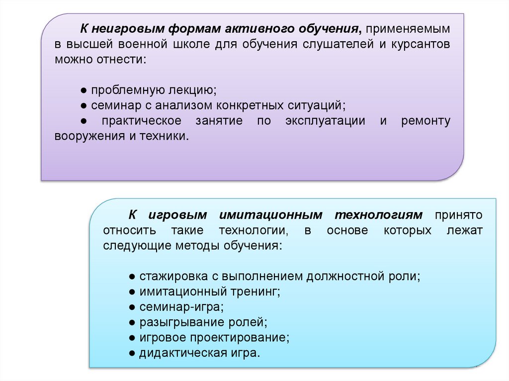 К неигровым формам активного обучения, применяемымв высшей военной школе для обучения слушателей и курсантов