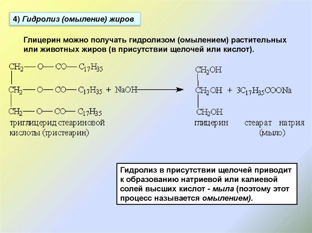 4) Гидролиз (омыление) жировГлицерин можно получать гидролизом (омылением) растительных