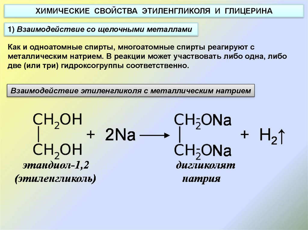 ХИМИЧЕСКИЕ СВОЙСТВА ЭТИЛЕНГЛИКОЛЯ И ГЛИЦЕРИНА1) Взаимодействие со щелочными металлами