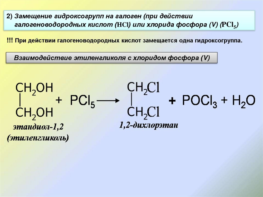 2) Замещение гидроксогрупп на галоген (при действиигалогеноводородных кислот (HCl) или хлорида фосфора (V) (PCl5)