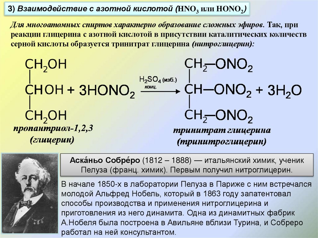 3) Взаимодействие с азотной кислотой (HNO3 или HONO2)Для многоатомных спиртов характерно образование сложных эфиров. Так, при