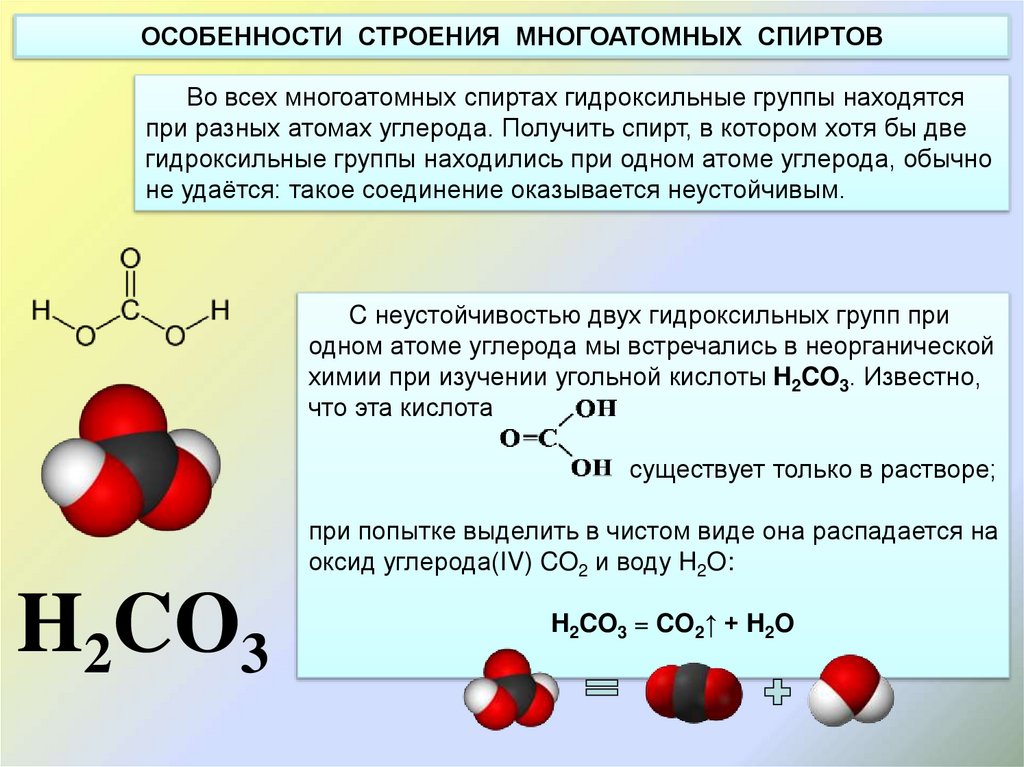 ОСОБЕННОСТИ СТРОЕНИЯ МНОГОАТОМНЫХ СПИРТОВВо всех многоатомных спиртах гидроксильные группы находятся