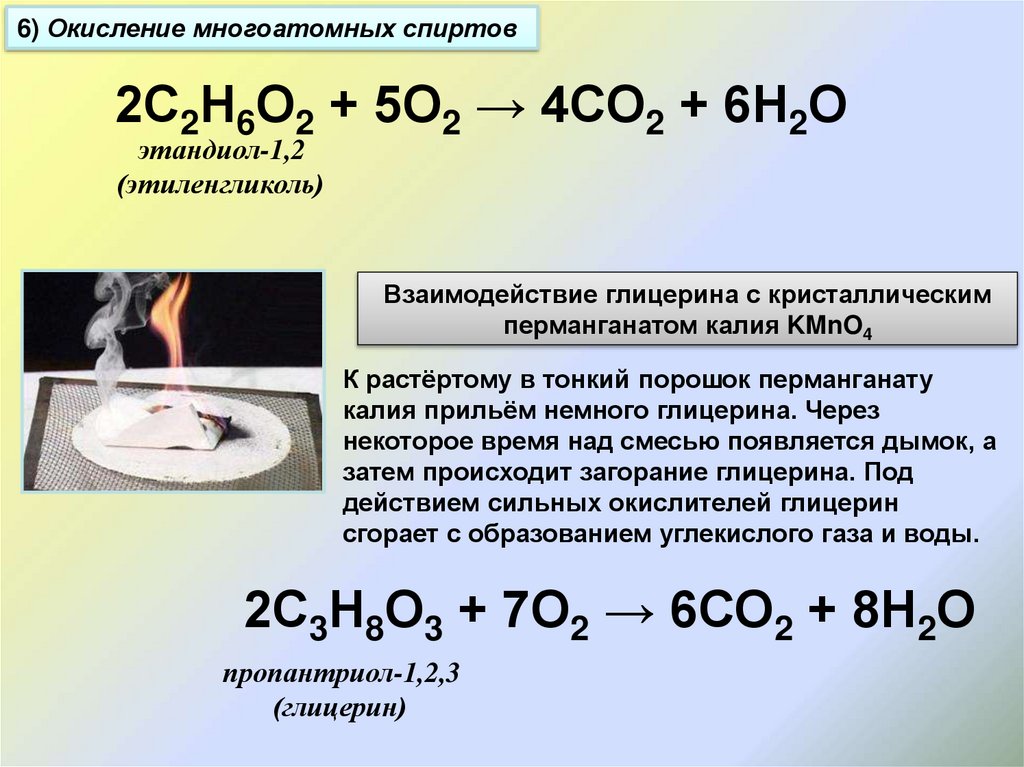 6) Окисление многоатомных спиртов2С2Н6О2 + 5О2 → 4СО2 + 6Н2О