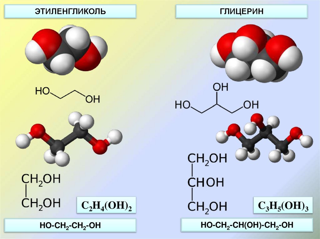 5) Качественная реакция на этиленгликоль и глицерин – взаимодействиесо свежеприготовленным гидроксидом меди(II) – Cu(OH)2