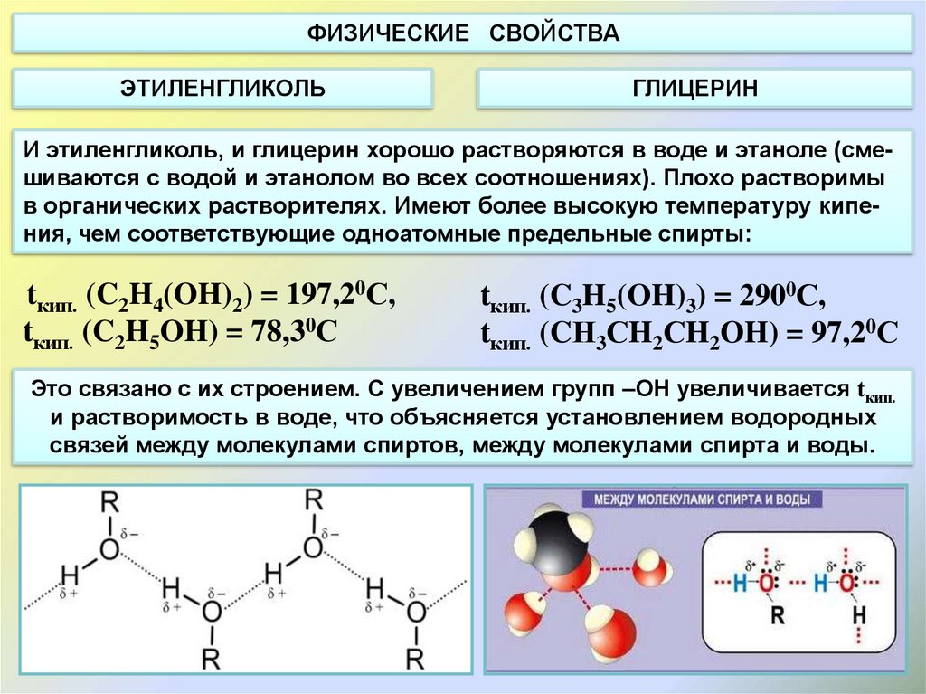 в органических растворителях. Имеют более высокую температуру кипения, чем соответствующие одноатомные предельные спирты: