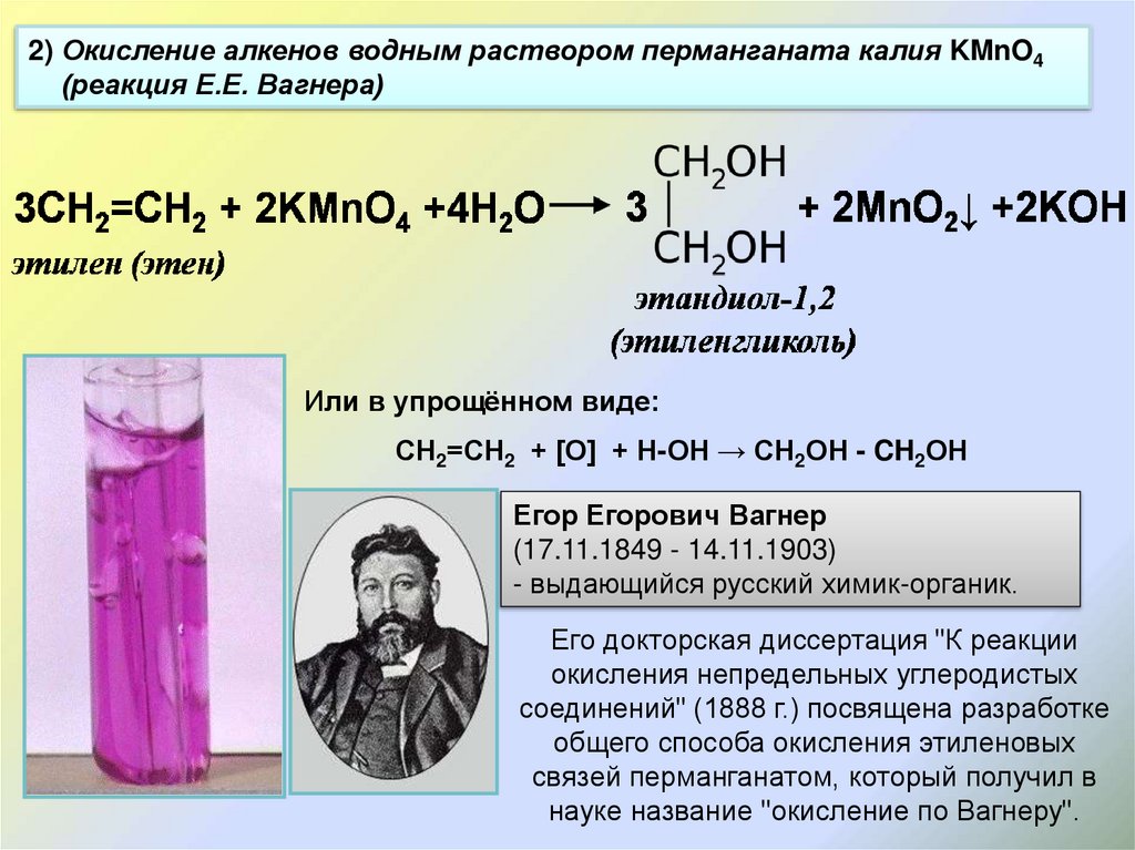 2) Окисление алкенов водным раствором перманганата калия KMnO4(реакция Е.Е. Вагнера)