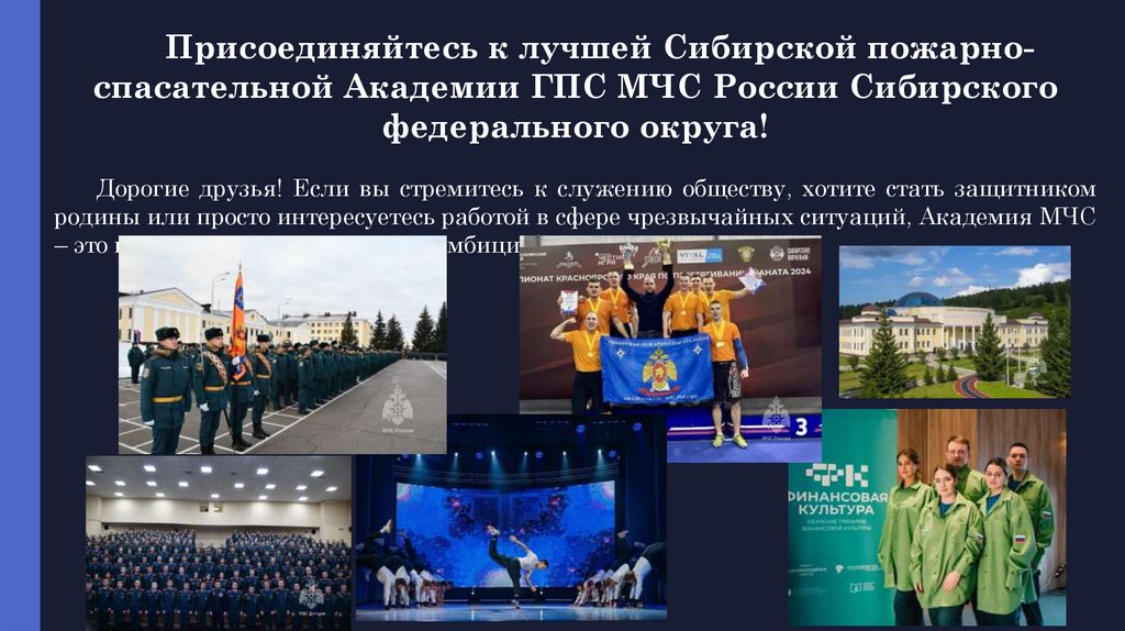 Присоединяйтесь к лучшей Сибирской пожарноспасательной Академии ГПС МЧС России Сибирскогофедерального округа!