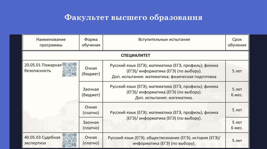 В академии проходит обучение на пяти факультетах:1. Факультет высшего образования