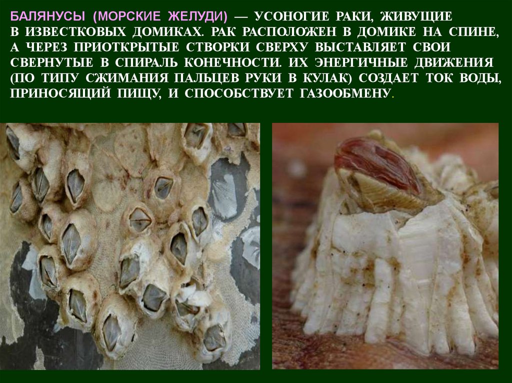 БАЛЯНУСЫ (МОРСКИЕ ЖЕЛУДИ) — УСОНОГИЕ РАКИ, ЖИВУЩИЕВ ИЗВЕСТКОВЫХ ДОМИКАХ. РАК РАСПОЛОЖЕН В ДОМИКЕ НА СПИНЕ,