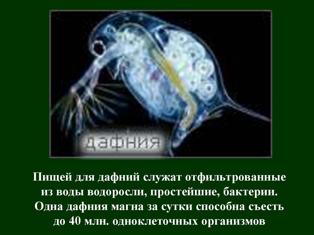 Пищей для дафний служат отфильтрованныеиз воды водоросли, простейшие, бактерии.