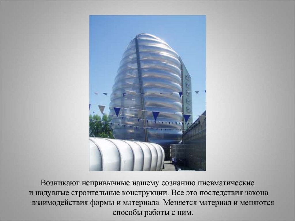 Возникают непривычные нашему сознанию пневматическиеи надувные строительные конструкции. Все это последствия закона