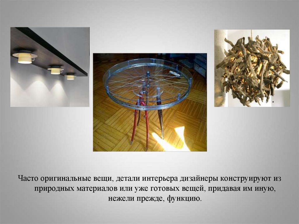 Часто оригинальные вещи, детали интерьера дизайнеры конструируют изприродных материалов или уже готовых вещей, придавая им иную,