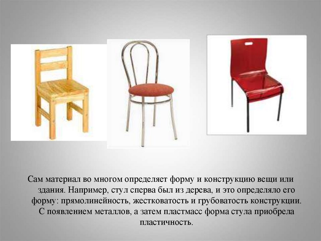 Сам материал во многом определяет форму и конструкцию вещи илиздания. Например, стул сперва был из дерева, и это определяло его