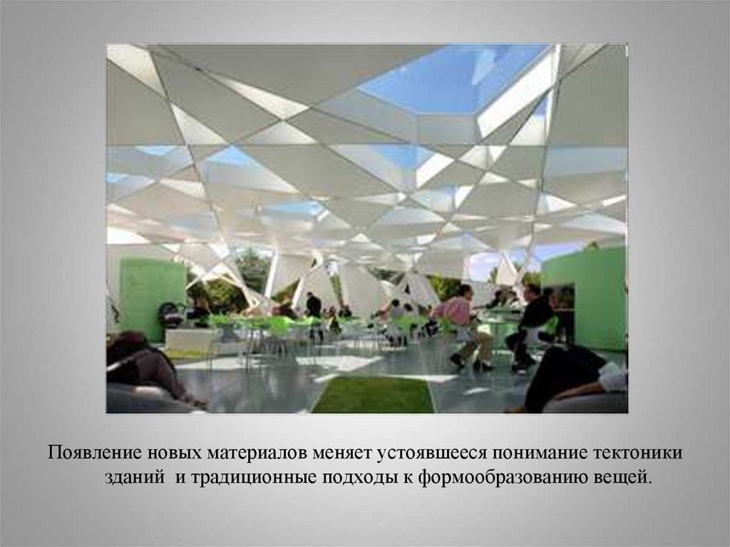 Появление новых материалов меняет устоявшееся понимание тектоникизданий и традиционные подходы к формообразованию вещей.