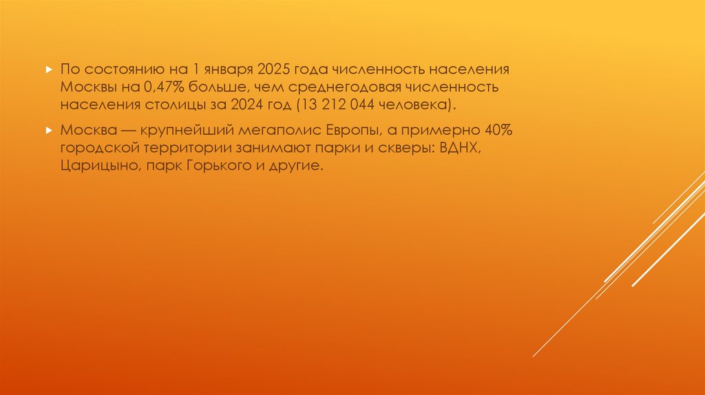 По состоянию на 1 января 2025 года численность населенияМосквы на 0,47% больше, чем среднегодовая численность