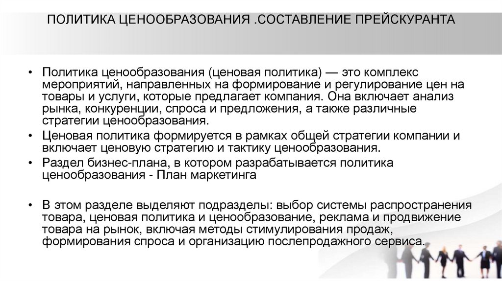 ПОЛИТИКА ЦЕНООБРАЗОВАНИЯ .СОСТАВЛЕНИЕ ПРЕЙСКУРАНТА• Политика ценообразования (ценовая политика) — это комплекс